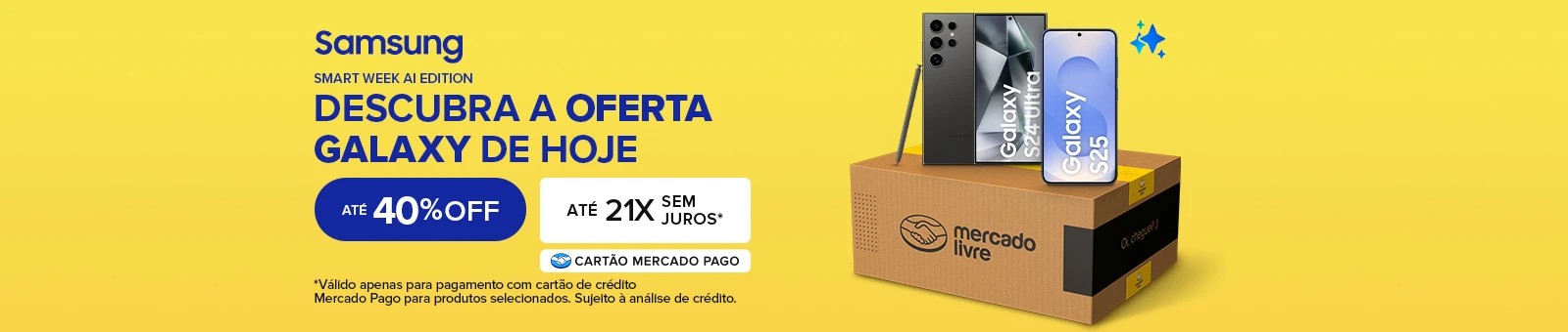Aproveite a Samsung Smart Week AI Edition no Mercado Livre e garanta até 40% de desconto em smartphones Galaxy selecionados. Além disso, é possível parcelar suas compras em até 21x sem juros no cartão Mercado Pago. Não perca essa chance de economizar com o cupom de desconto especial.