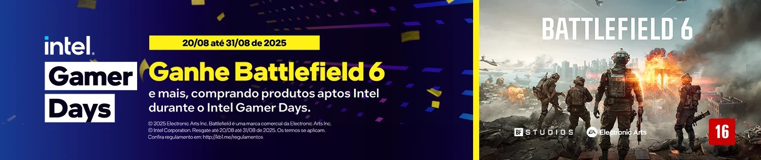 Na compra de processadores Intel selecionados na Kabum você ganha o jogo Battlefield 6 como presente. Uma promoção imperdível para turbinar o PC gamer e ainda garantir um super título.