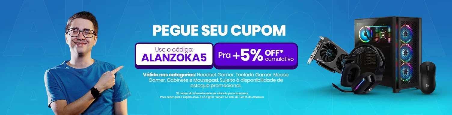 - O cupom do Alanzoka pode ser alterado periodicamente. Para saber qual o cupom ativo, é só digitar "cupom" no chat da Twitch do Alanzoka.